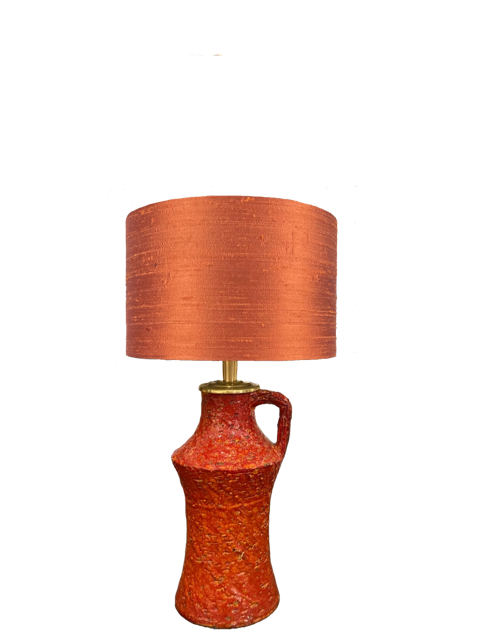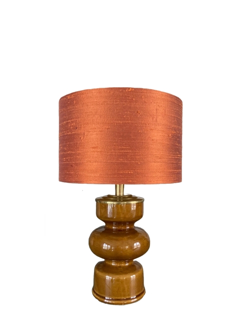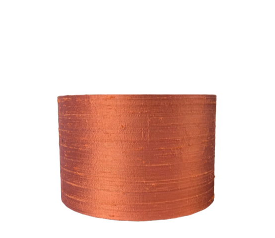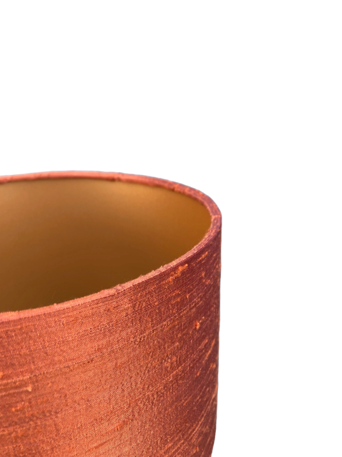 Een hele rijke stof van 100% zijde. Zijde herken je aan de matte glans, de wat onregelmatige zijde textuur en de lijnen. Een prachtstof in een ietwat bruinige oranje. De stof en de folie zijn lichtdoorlatend en geven een gouden gloed als de lamp aan is. Een en al sfeer dus!