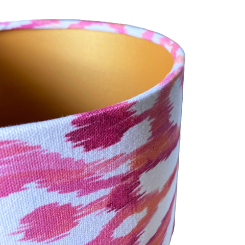 Deze licht doorlatende kap met oranje-roze print maken jou en je huis instant vrolijk. Bedrukte stof in Ikat-motief.