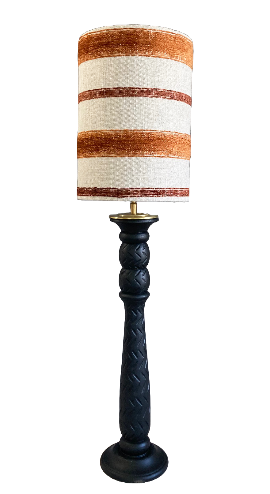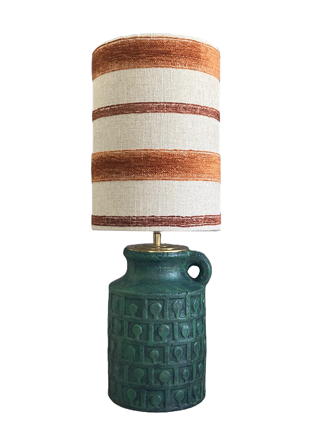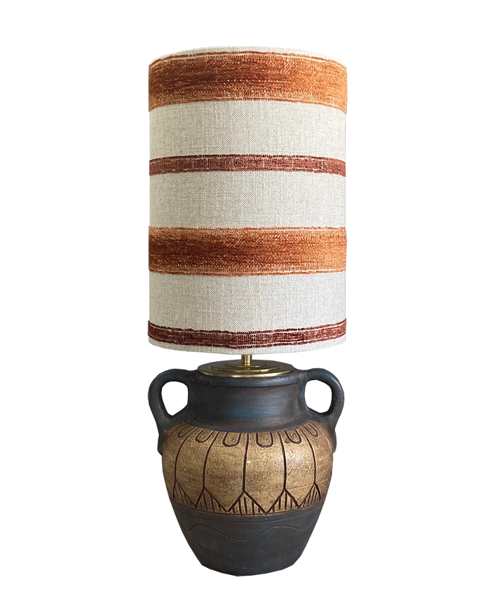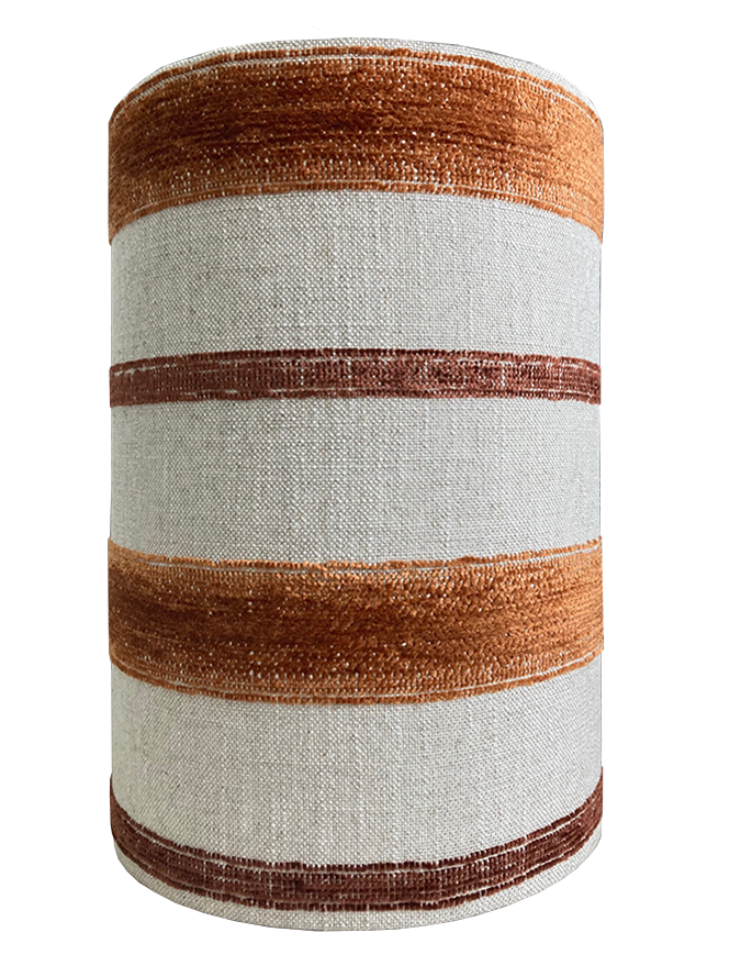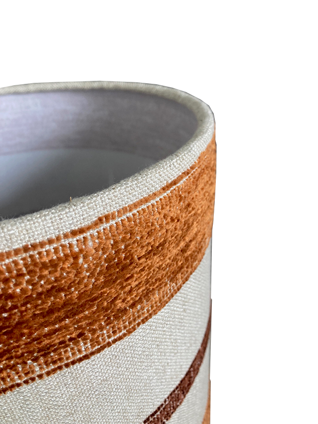 Verrassend mooie geweven stof. Lichtgrijze basis met velours strepen in terra kleuren. De strepen zijn dikker en dat geeft nog wat meer gelaagdheid. Past bij veel lampenvoeten en in vele stijlen interieur; van klassiek tot bohemien.