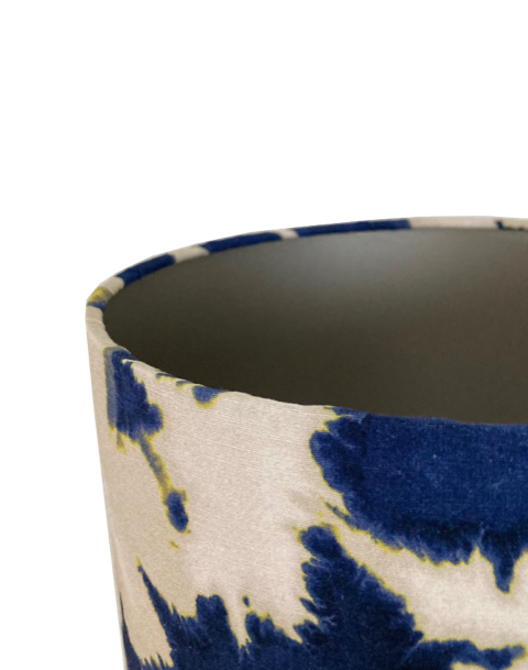 De kap is van niet-lichtdoorlatende taupekleurige folie wat mooi past bij blauwe of bruine lampenvoeten.